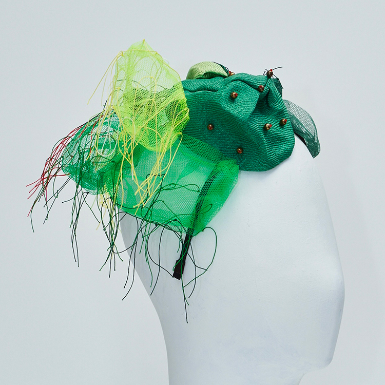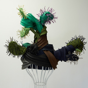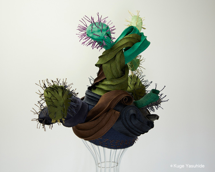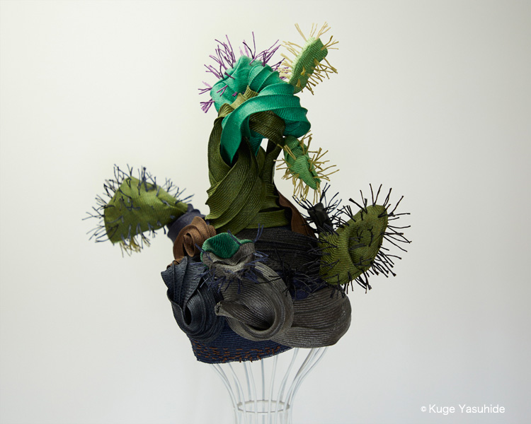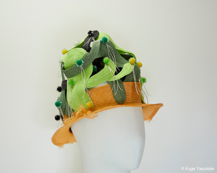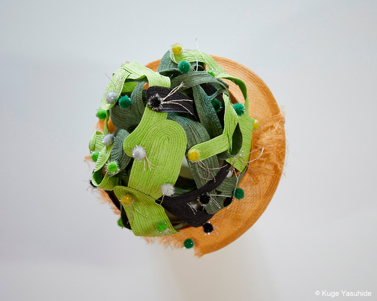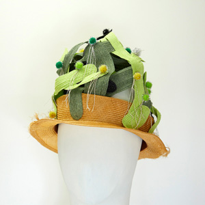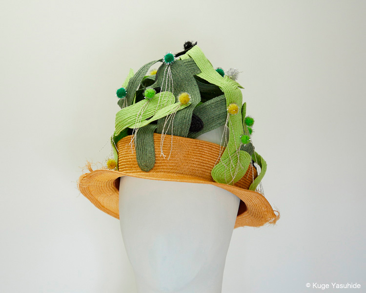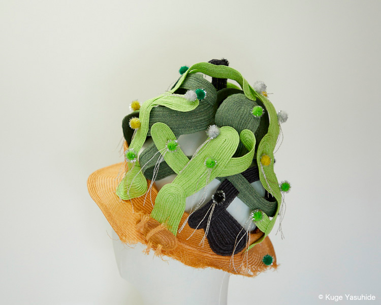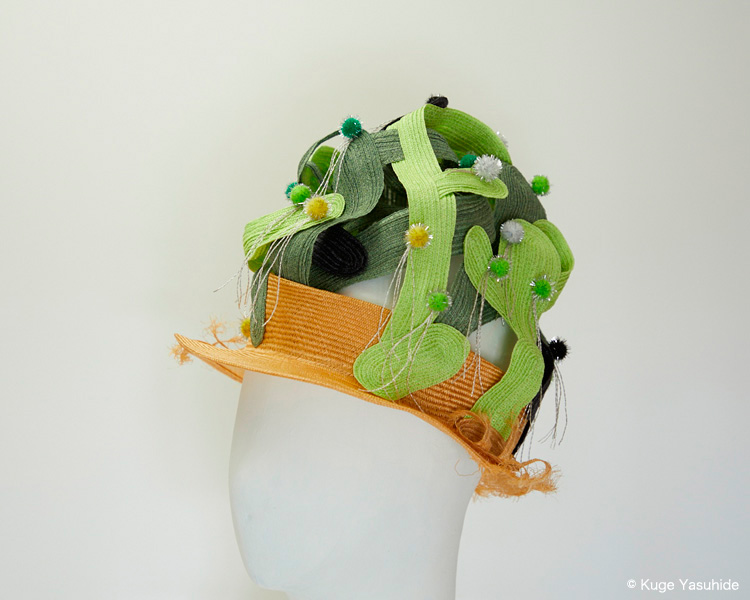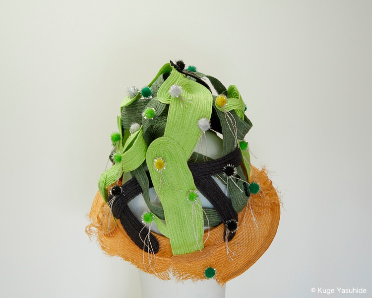 帽子展では、メキシコの風景や色彩、サボテンを思い浮かべながら制作した帽子が並びました。その中の3点を観てください。